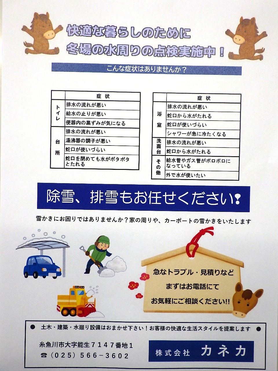 今シーズンは大雪が予想されております。この度、新型の除雪機を導入いたしました。家の周りの除雪は是非弊社にお任せください!! ご連絡お待ちしております。